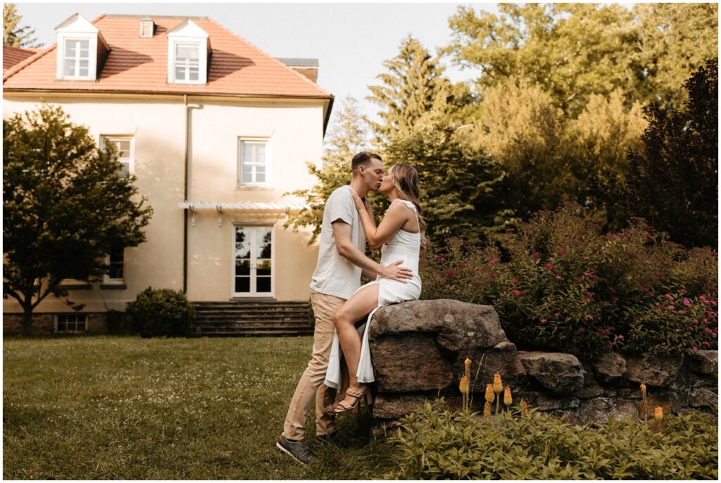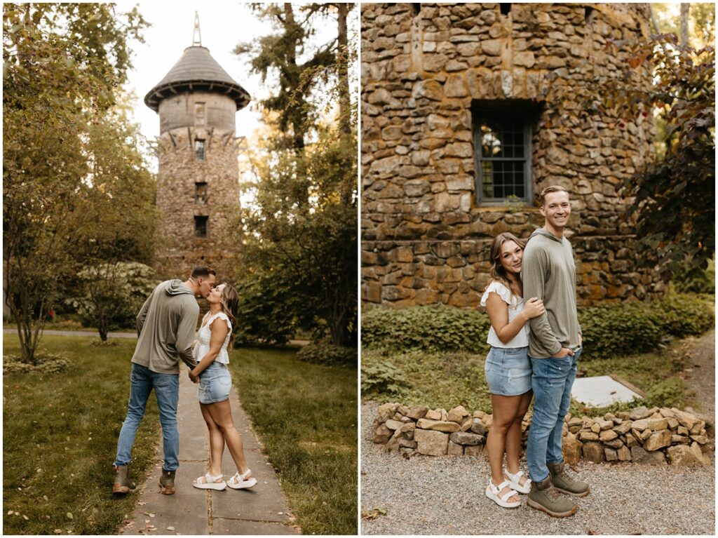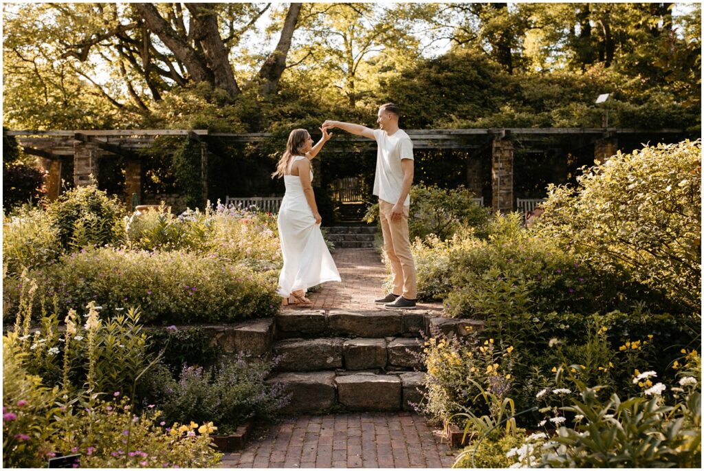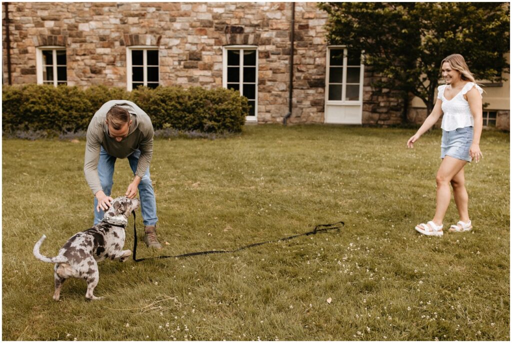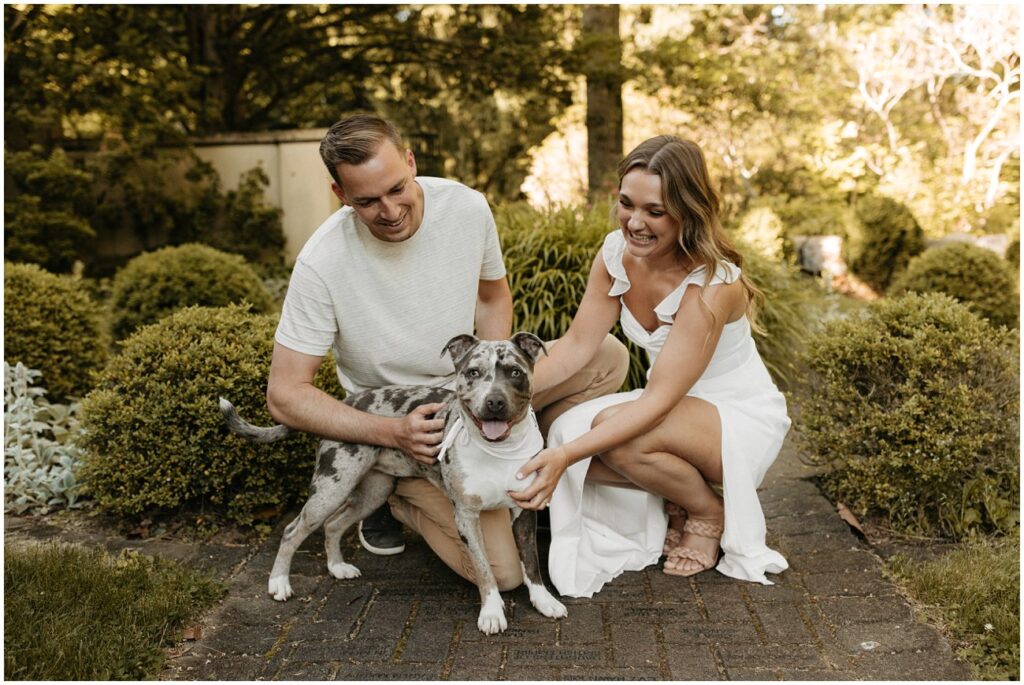 Cross Estate Gardens is one of my favorite New Jersey engagement session locations because of the variety it offers in a small amount of space! Plus, it’s free to photograph there – such a win! We had everything from romantic and lush gardens to plenty of fields for Arya to explore to the stone tower and sweeping trees that make you feel like you’ve been transported to the PNW! Alyssa and Colin came prepared with fancy and casual outfits, which allowed us to capture a ton of fun moments, especially toward the night as they were running and jumping all over the place!