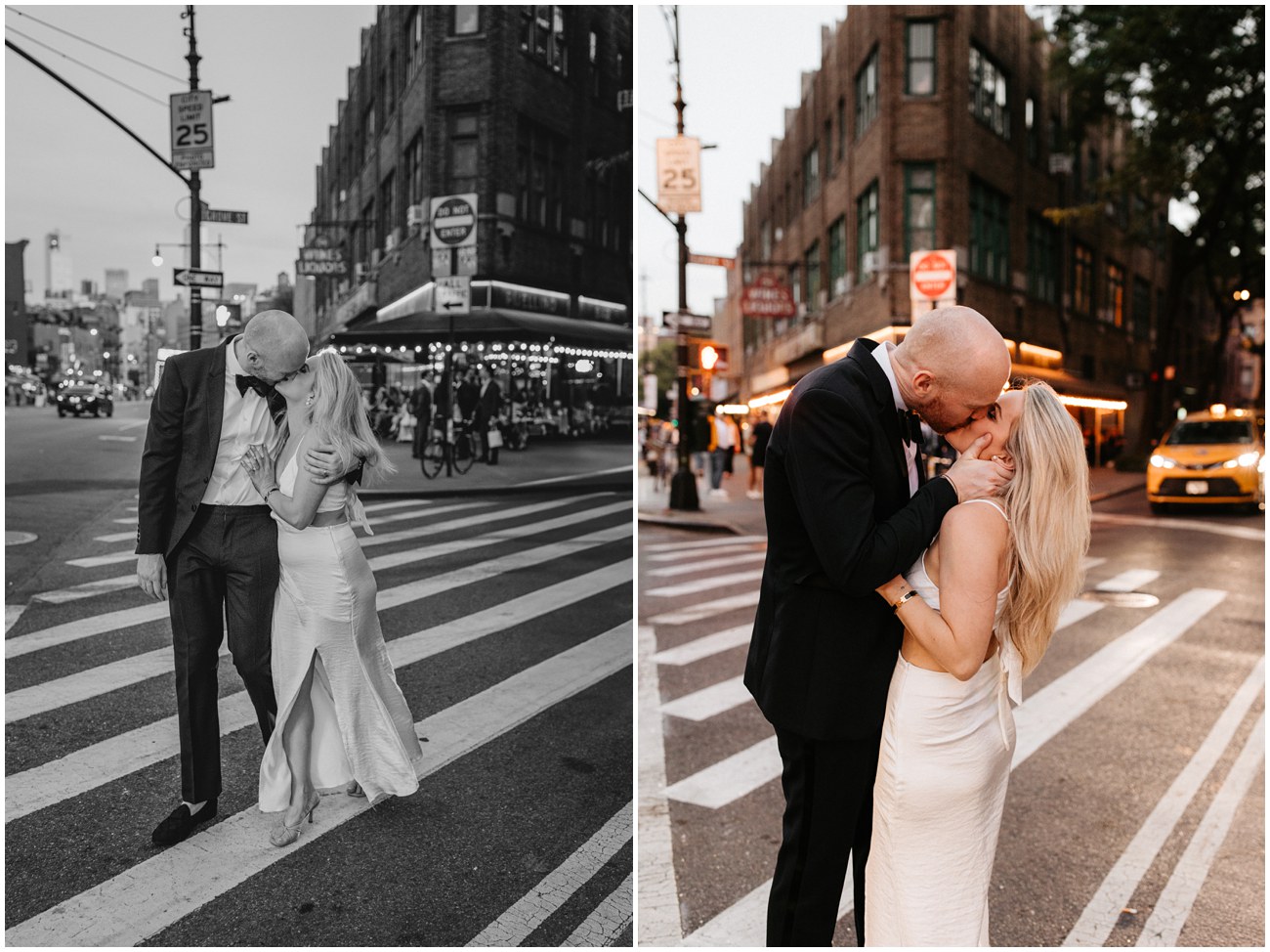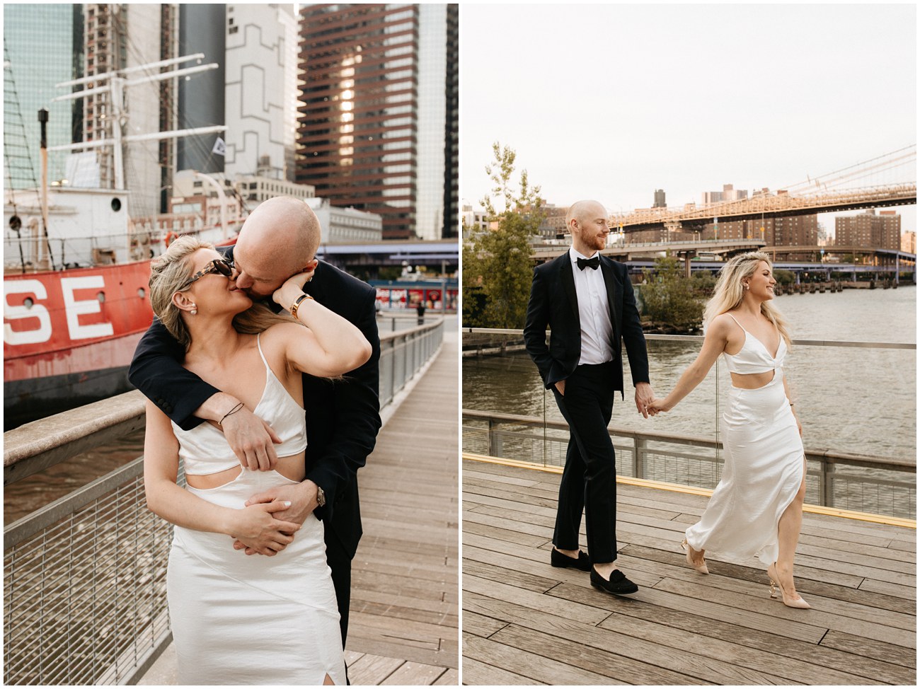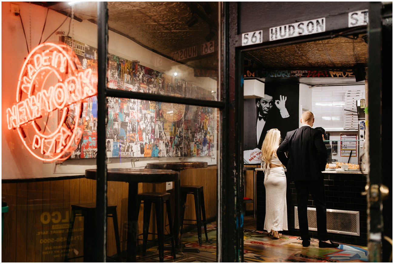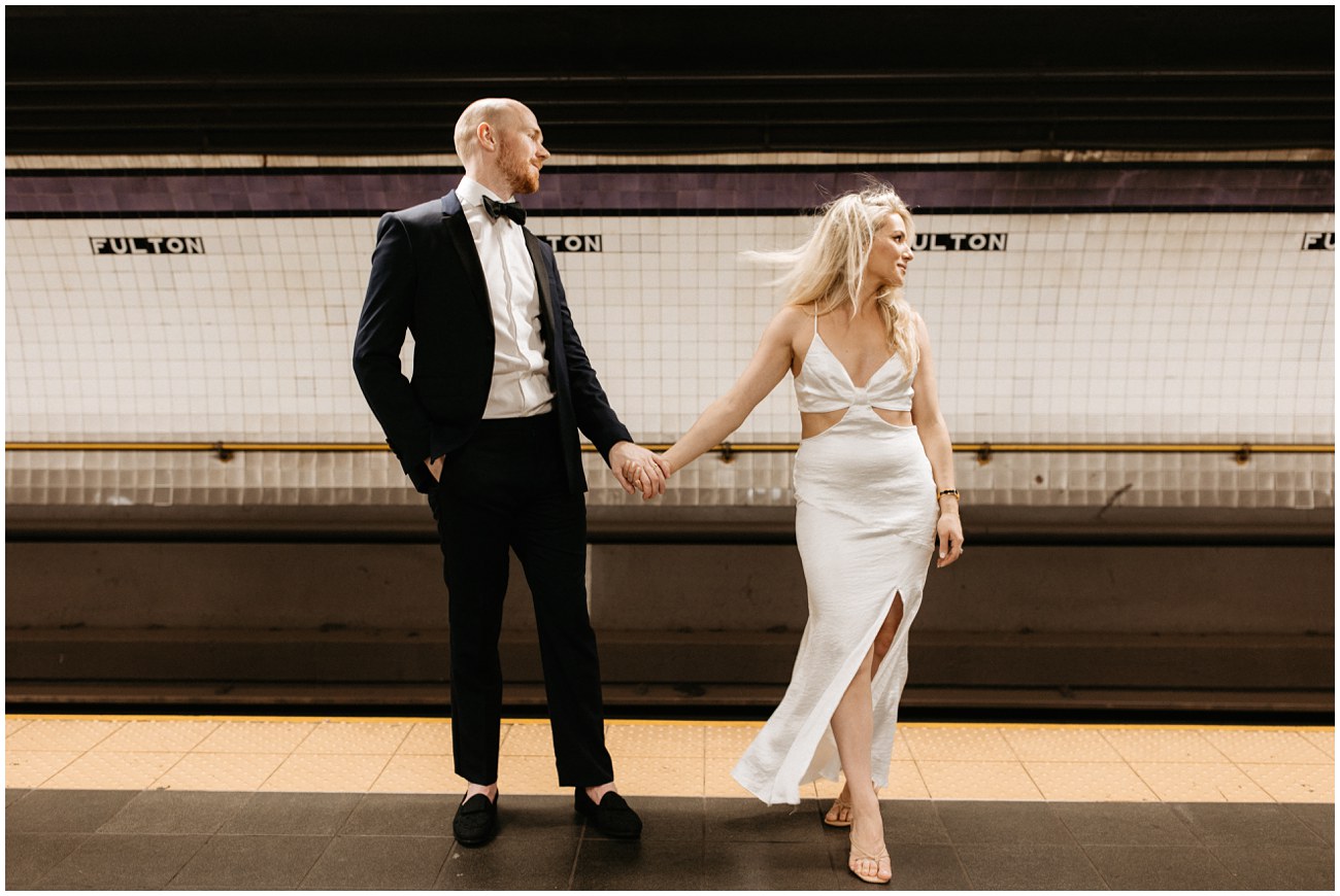 Mark showed up looking dapper in a clean-cut suit and loafers while Anisa, an absolute stunner, rocked a satin white dress that gave all the bridal vibes! Then, they changed into a more casual look for fun flash photos at night! The perfect outfits for exploring around FiDi and the West Village!